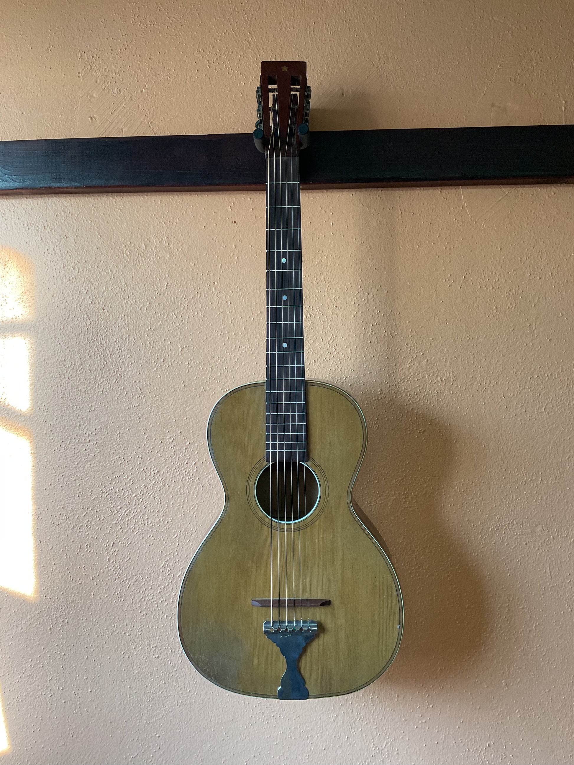 This early 1900s 12 fret parlor guitar is made with Birch back and sides and a spruce top. With a brand new fret board and new frets this little guitar plays and sounds like a dream, and probably better than the day she was bought! 1 13/16” nut width, 24 3/8” scale length and a rosewood bridge.